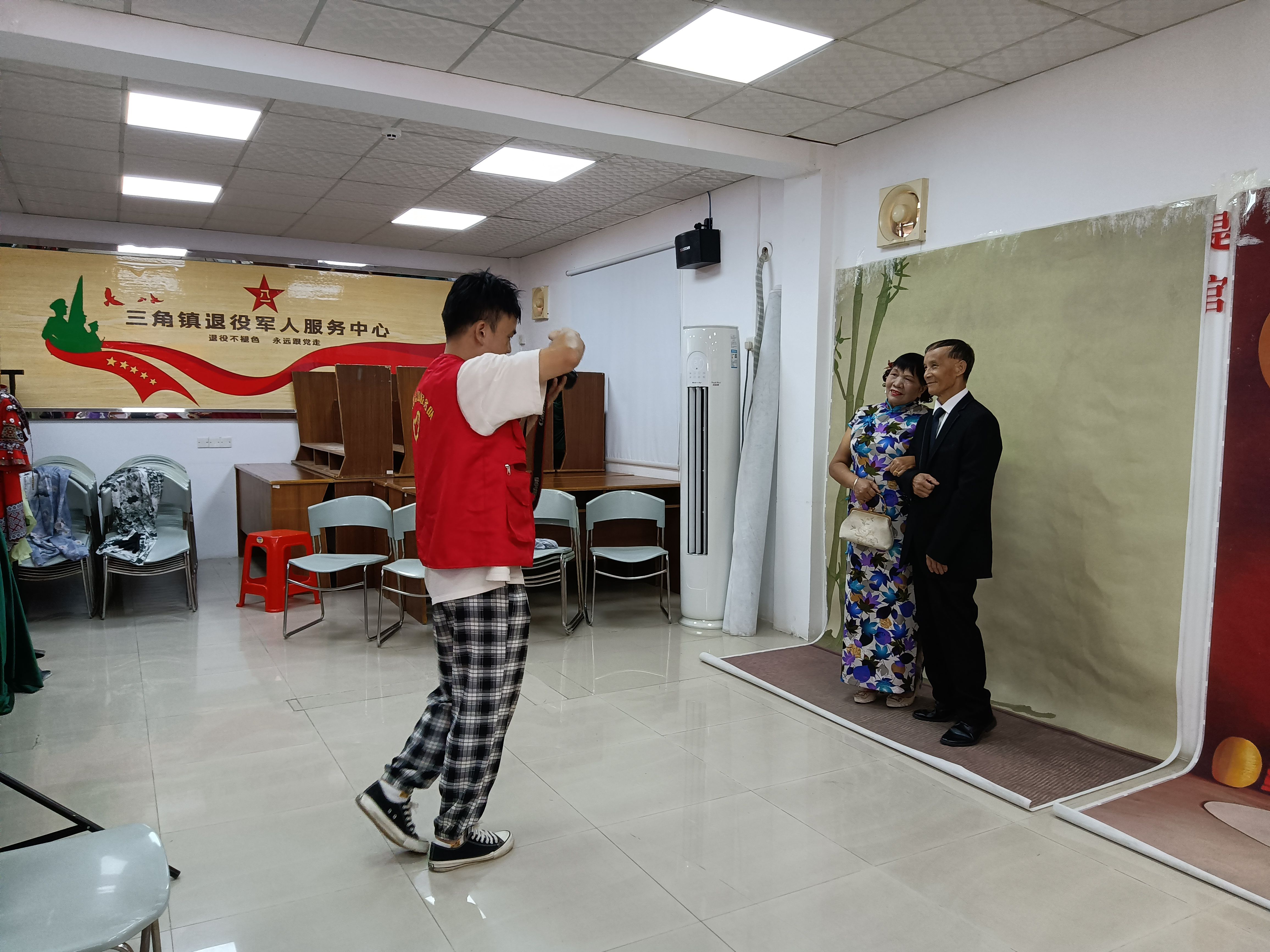 活动现场,三角镇退役军人服务中心的会议室被精心布置成临时摄影棚,分为摄影区、化妆区、服装区、选片区和等候区等多个功能区域,流程清晰、服务周到。工作人员耐心为退役军人及家属化妆、整理服装、调整发型,细致指导拍摄姿势与表情。摄影师一边捕捉动人画面,一边认真倾听老兵们讲述峥嵘岁月。在轻松愉快的氛围中,一个个拍摄任务顺利完成,活动现场欢声不断、暖意融融。