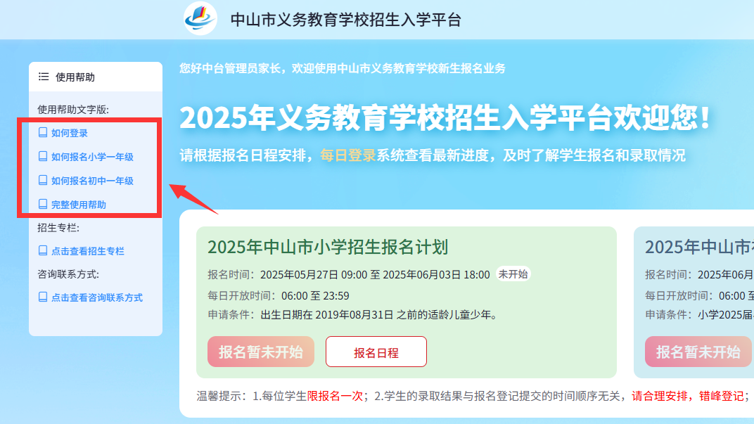 招生入学平台页面有视频版和文字版的使用帮助说明,供家长们查阅。具体可看下图: