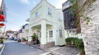 穿过米铺巷,来到寮后大街,就可以偶遇到一栋油画风的寮后阅书报馆。报馆建于民国十七年(公元1928年),是当年华侨捐资建设而成。两层砖木结构的骑楼建筑,搭配上薄荷绿的外墙、精美的浮雕,非常有油画感。